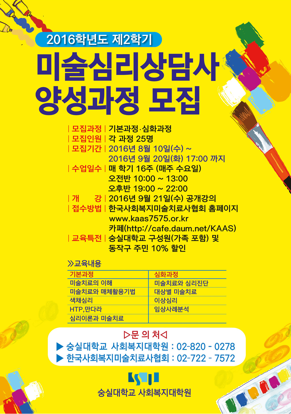 2016³â °¡À» ¹Ì¼ú ½É¸® »ó´ã»ç ¾ç¼º°úÁ¤ 9/21(¼ö) °³° ¸ÅÁÖ ¼ö¿äÀÏ ¼ö¾÷ ±âº»°úÁ¤ 19 :00 ~ 22 :00 ½ÉȰúÁ¤ 10 :00 ~ 13 : 00 * ±âº»°úÁ¤ : ¿þ½ºÆ®¹Î½ºÅÍȦ 550È£ ½ÉȰúÁ¤ : ¿þ½ºÆ®¹Î½ºÅÍȦ 434È£